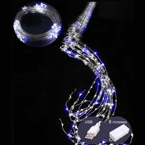 електрогірлянда пучок-роса 200 LED, 10 ліній по 2м., 8 режимів, USB, синьо-білий колір 1920-23