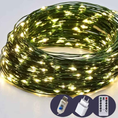 електрогірлянда роса 100 LED, 10м., зелений провід, USB, пульт д/к, теплий білий колір 19011-07