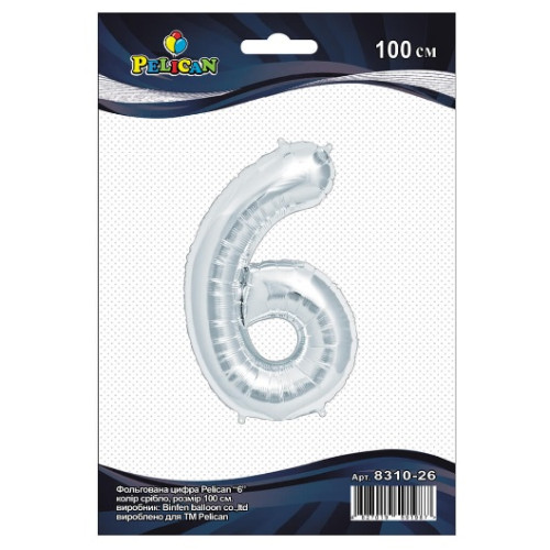 кулька-цифра фольгована Pelican 100см. срібло "6" 831026 (5/50/500)