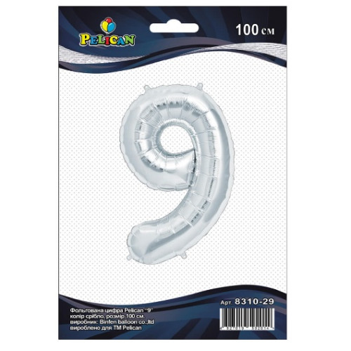 кулька-цифра фольгована Pelican 100см. срібло "9" 831029 (5/50/500)