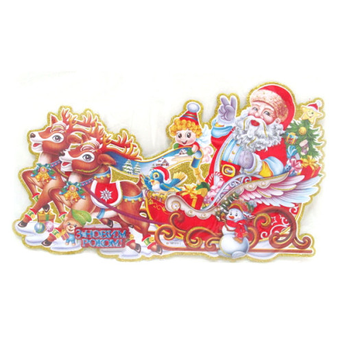 плакат новорічний 7042-2 "Дід Мороз в упряжці" 45см. укр. напис (10)